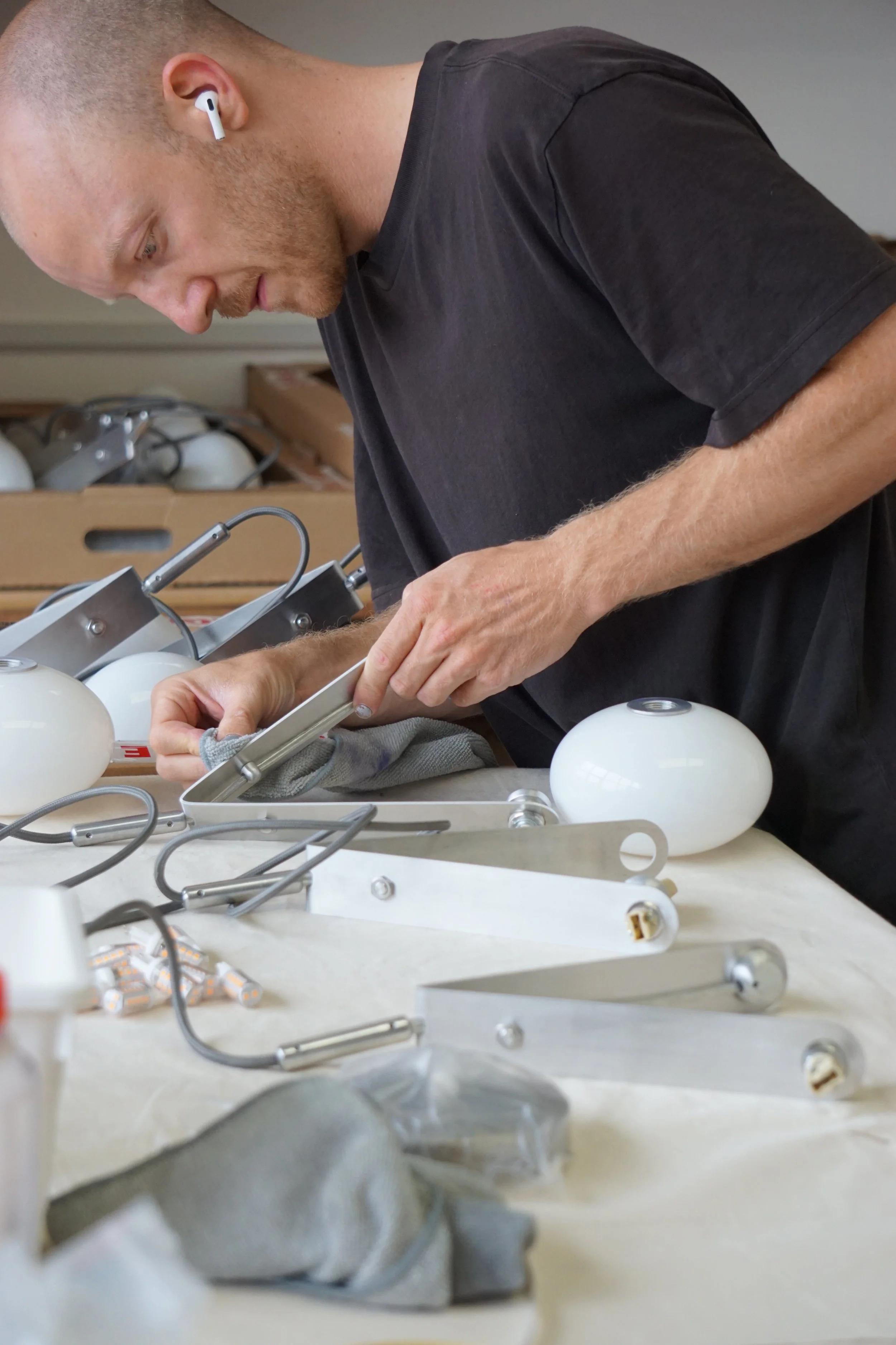 Each design is conceptualised, crafted, and assembled in the London studio, evolving from intuitive paper models to refined prototypes and finished works. All fixtures are hand-finished and assembled in our London studio. Alongside this in-house making, the studio collaborates with skilled artisans and creatives across disciplines to explore new material and technical possibilities.